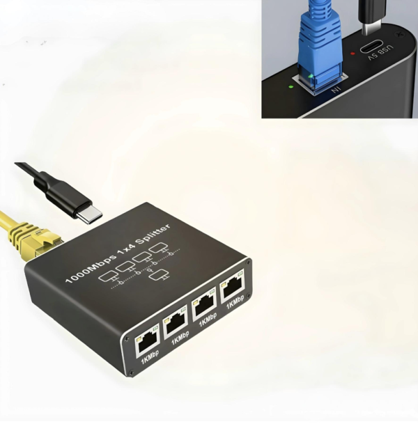 Gigabitowy splitter RJ45 1→4 (1000 Mb/s) – mini przełącznik LAN, zasilanie USB, stabilny sygnał